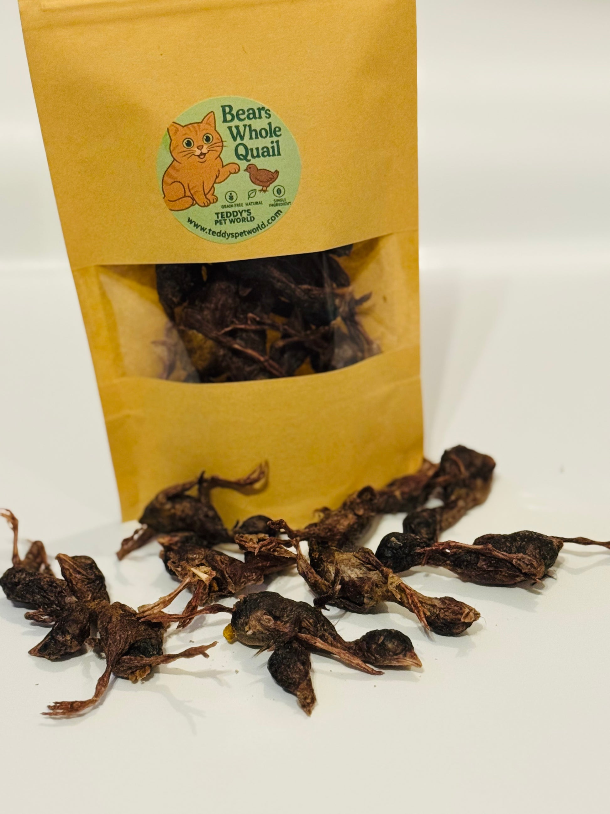 Bear’s Whole Quail delivers whole-prey nutrition in a bite-sized snack. This premium treat includes soft bone and organ, making it a natural source of calcium and taurine.